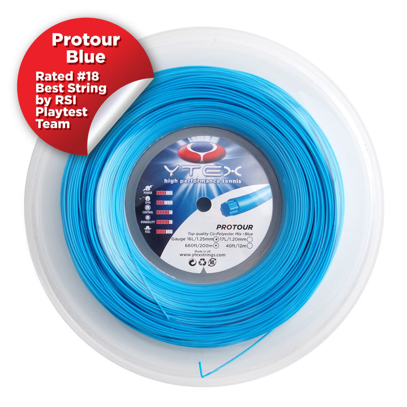 Köp en tennissena i polyester som är mjukare tack vare att den innehåller co-polyester + kol + polyeten co-polymeriserade senan. Den blåa ProTour svarar bättre upp på dina slag än många polyestersenor. Dess exklusiva patenterade lågmolekylärt Technology (LMWT) med tillsats av olefiner och smörjmedel ger den ett unikt utseende och briljans. En härlig känsla att slå till bollen med denna riktigt snygga blå senan.